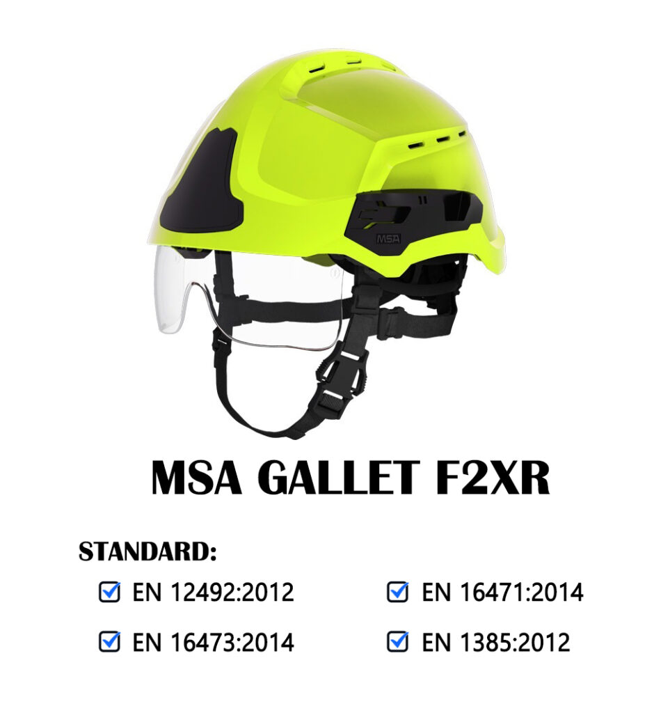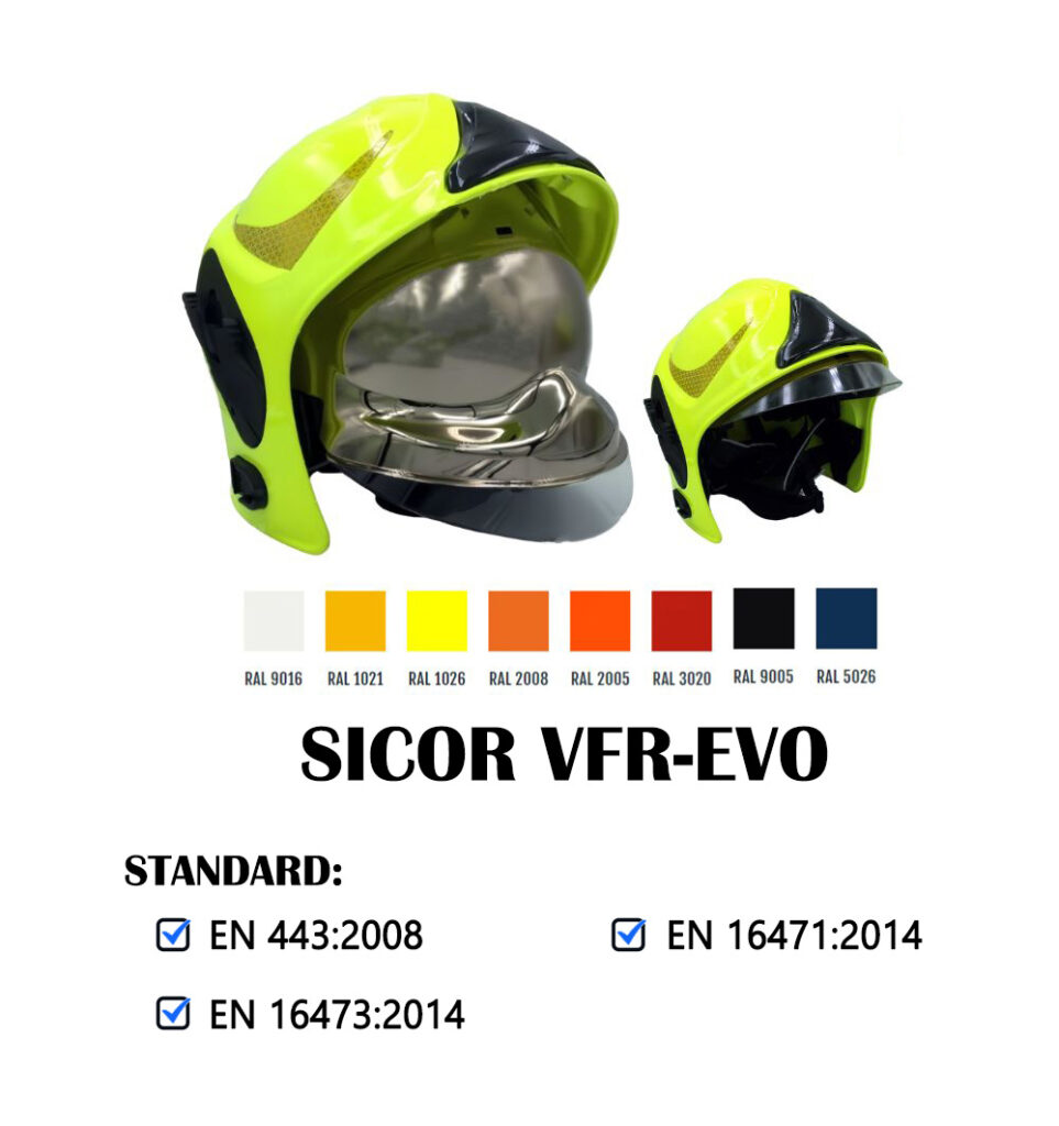 This helmet is mainly suitable for rescue work. The helmet structure is made of hard plastic (THERMOPLASTIC) with 10 ventilation holes. It comes with a protective net and a FREE SIZE visor that can be adjusted to fit the head. It is available in 4 colors: white, red, yellow, and lime green. It is certified according to European standards.