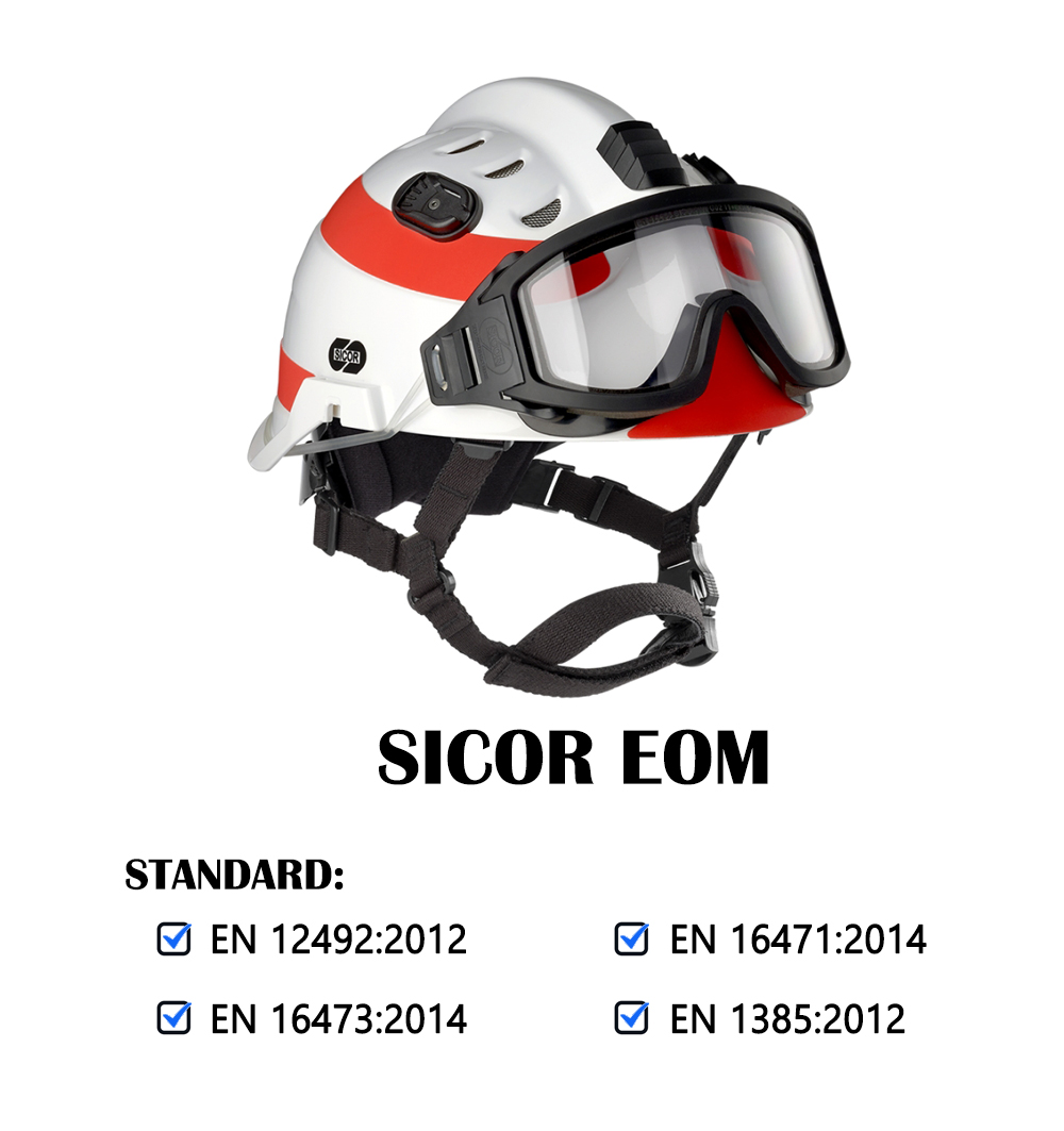 This helmet is mainly suitable for rescue work. The helmet structure is made of hard plastic (THERMOPLASTIC) with 10 ventilation holes. It comes with a protective net and a FREE SIZE visor that can be adjusted to fit the head. It is available in 4 colors: white, red, yellow, and lime green. It is certified according to European standards.
