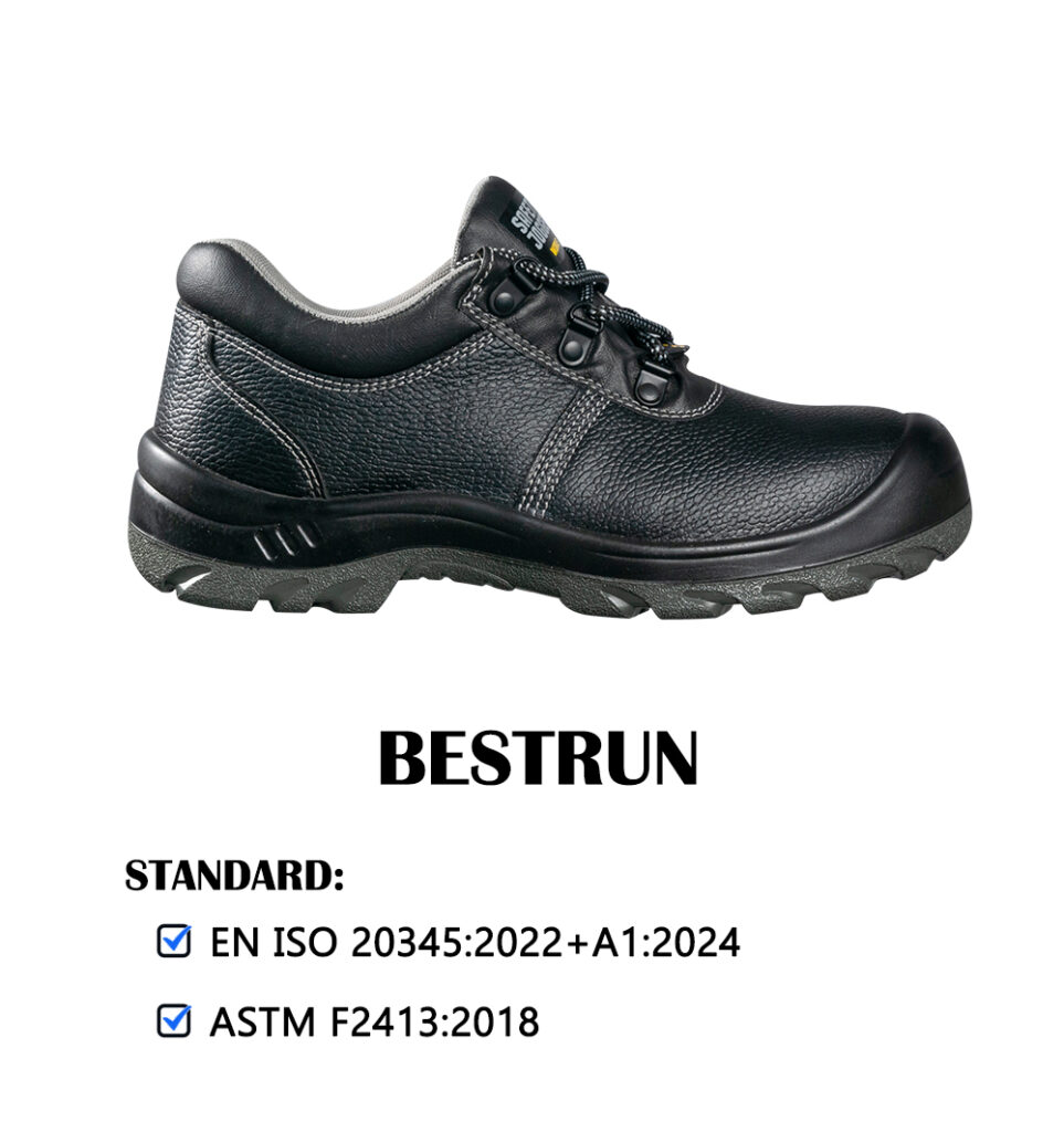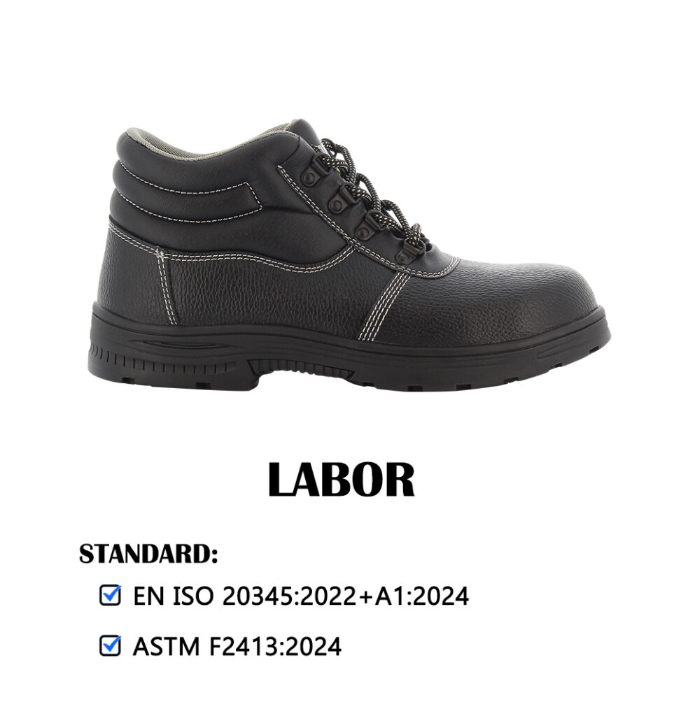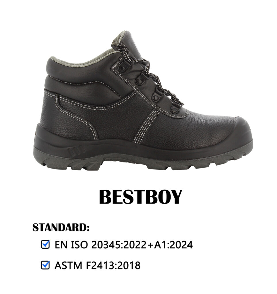 Safety shoes with heel, genuine leather, PU sole, steel toe, impact resistance 200 joules, steel plate sole to prevent puncture, nylon mesh lining, good ventilation, resistant to oil, mild chemicals and heat, anti-static.