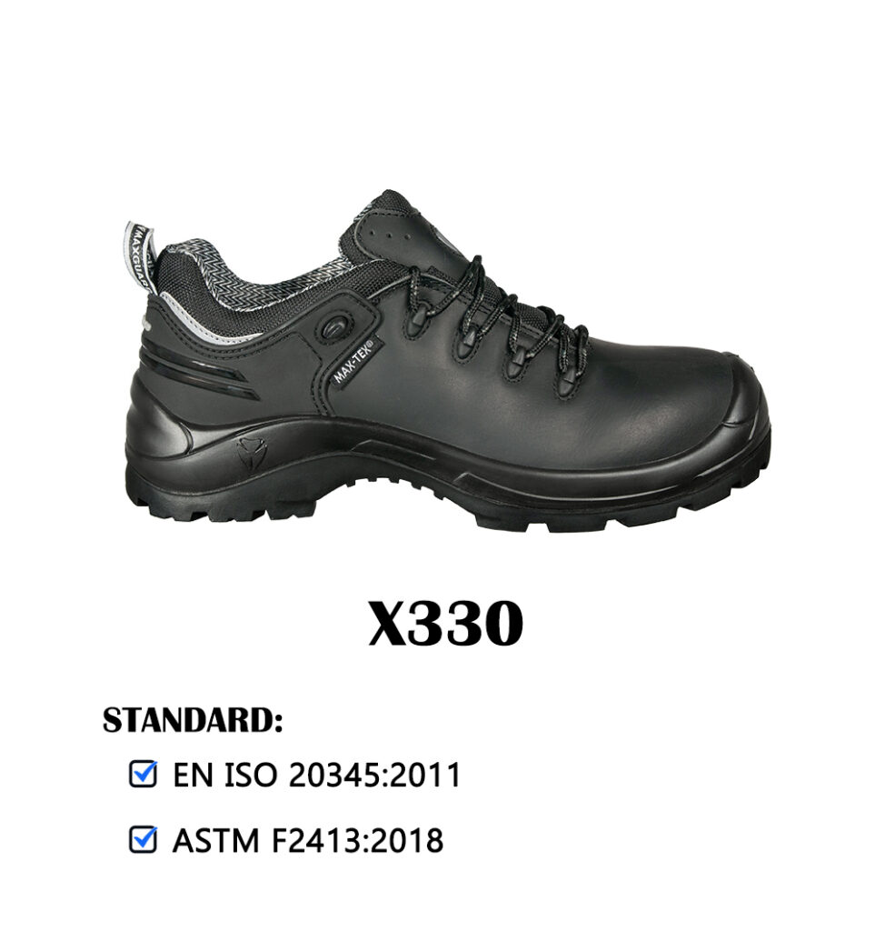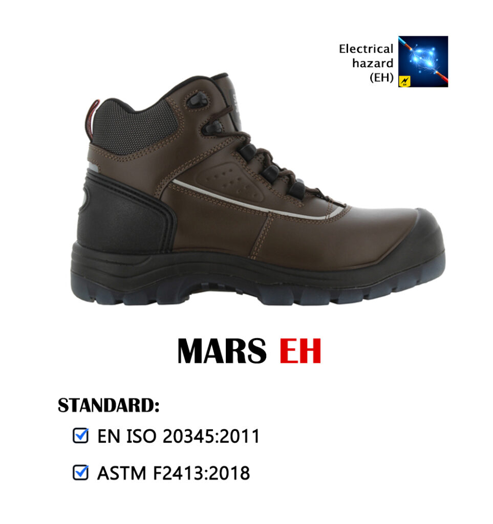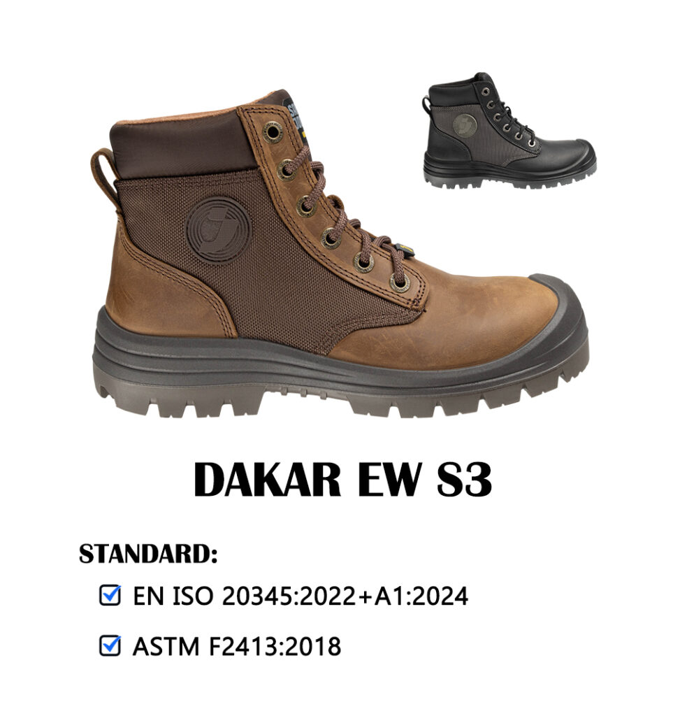heat-resistant outsole, composite toecap, metal-free design, water-resistant leather upper, a zipper and non-marking rubber outsole.