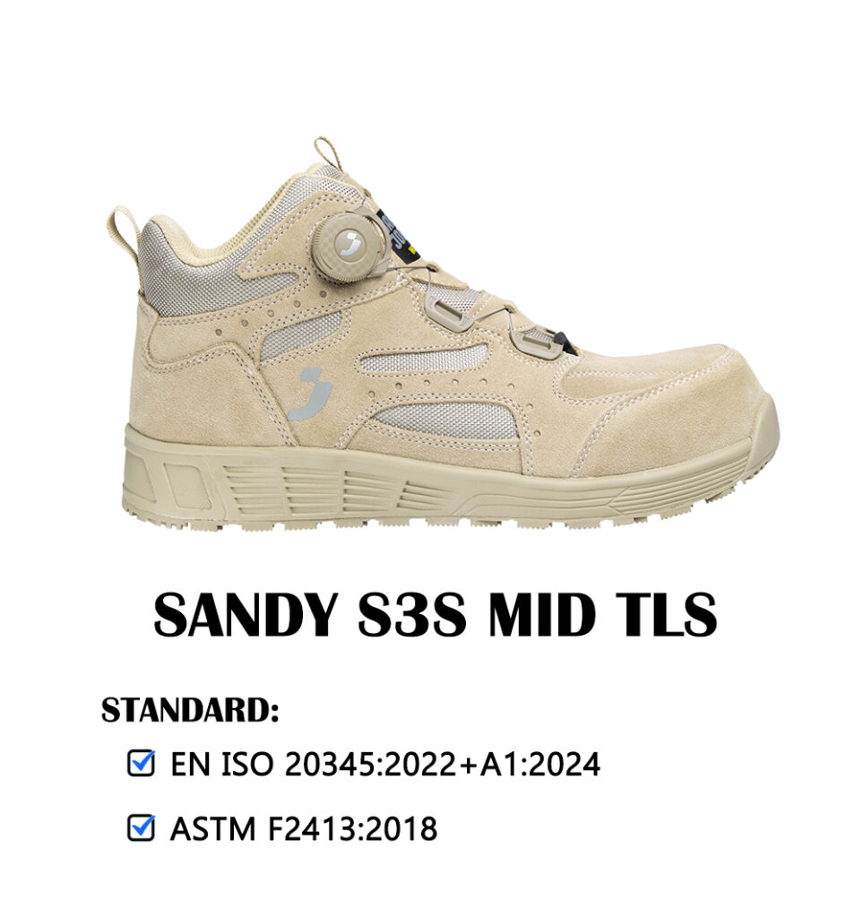 Lightweight, metal-free, ankle-high safety shoe with suede upper and TLS closure system, ideal for logistics and light industry. Memory foam insole and SR level outsole. Also features TLS composite for safety, fabric midsole and ESD certification for excellent anti-static properties.